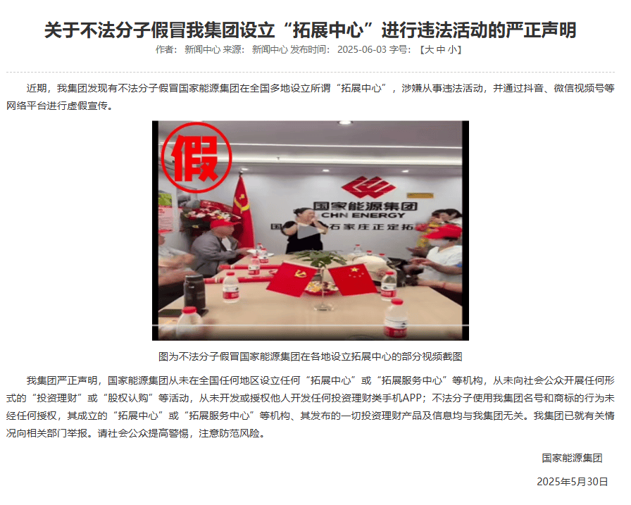 事实上,国家能源集团已多次公开声明,从未开发任何官方APP,也未设立所谓的“拓展中心”。请公众务必提高警惕,谨防上当。
