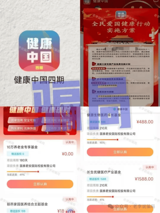 “健康中国”诈骗项目已推出四个版本,第四期于9月6日上线。尽管不确定是否为同一团伙操作,但诈骗套路如出一辙: