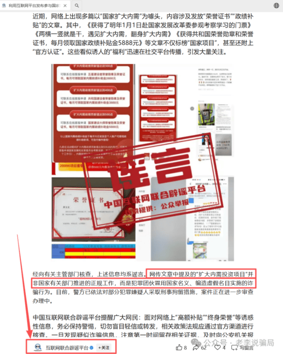 今年9月初,网信办互联网联合辟谣平台也已公开辟谣,指出有人借“参与国家项目获荣誉证书”进行诈骗,部分涉案人员已被刑事拘留。