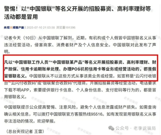 7月10日,中国银联发布声明,凡以“中国银联工作人员”“中国银联某产品”等名义开展招股募资、高利率理财、信用卡逾期处理等业务的,均为假冒。