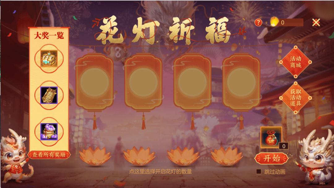 活动内容:元宵佳节,幸运天定!消耗金子参与祈福,抽取您的专属“幸运数字”。无论您是抽中幸运数字、祈福次数上榜,还是幸运数排名靠前,均可斩获惊喜大奖!